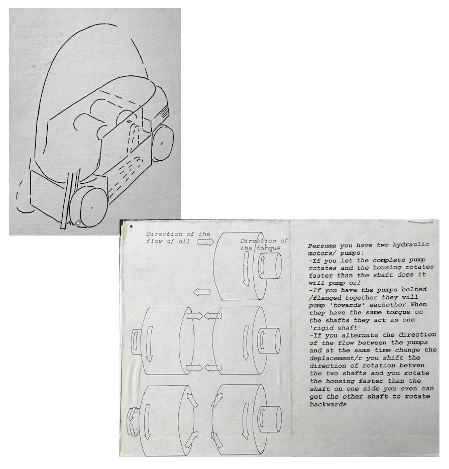 What happens if you let two hydraulic pumps/motors with variable-displacement which are connected back to back pump towards each other and on the other hand work together and each of them with different displacement and the whole device in addition is rotating?